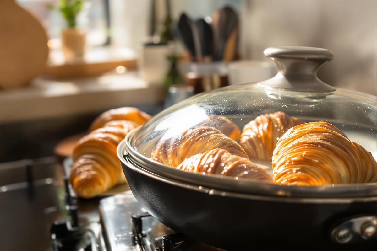 Cette méthode innovante permet de cuire les croissants à la vapeur, directement dans une poêle à couvercle épais. Résultat ? Une cuisson uniforme, un feuilletage respecté et une belle croûte dorée.